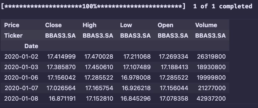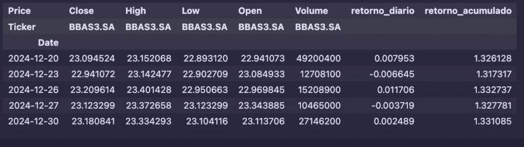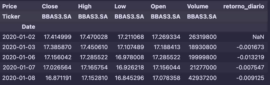 O resultado é um DataFrame com MultiIndex (colunas agrupadas). Para nossos cálculos, só nos interessa o Close.