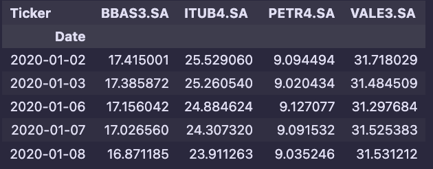 tickers = ['BBAS3.SA', 'VALE3.SA', 'PETR4.SA', 'ITUB4.SA']