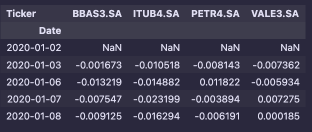 retornos_diarios_multiplos = precos_adj.pct_change()