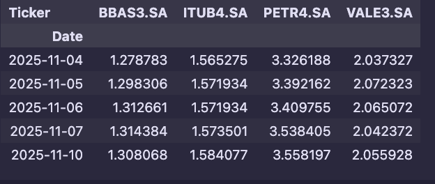 O verdadeiro poder do Pandas brilha quando escalamos. Vamos agora fazer o mesmo cálculo para um portfólio de blue chips brasileiras: Banco do Brasil (BBAS3.SA), Vale (VALE3.SA), Petrobras (PETR4.SA) e Itaú Unibanco (ITUB4.SA).