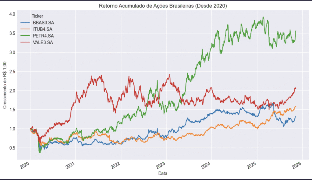 (Resultado esperado: um gráfico mostrando as linhas de BBAS3.SA, VALE3.SA, PETR4.SA e ITUB4.SA divergindo ao longo do tempo.)